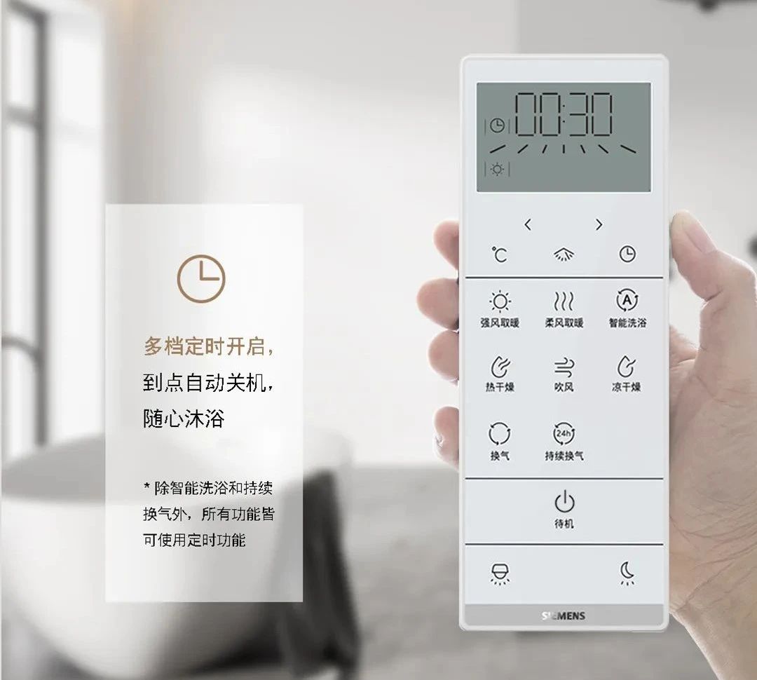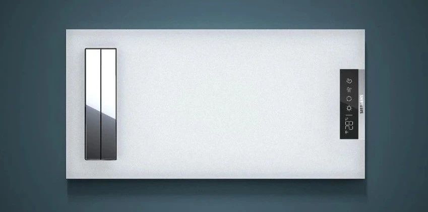 设计理念不仅源自于德国包豪斯简约几何的风格,还传承了品牌方经典的建筑美学。横平竖直的线条形成直观的功能区域划分,并且运用了拉丝金属搭配黑色玻璃的品牌设计语言。在浴暖机新产品线上,我们沿用SIEMENS经典的设计语言,以平直的线条和清晰的区域划分构成了浴霸简洁明了的整体。
