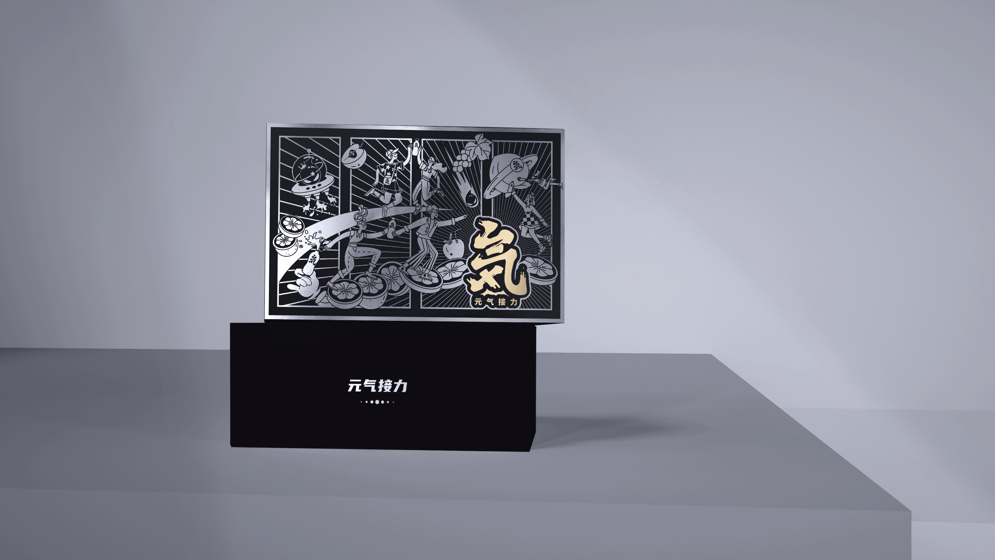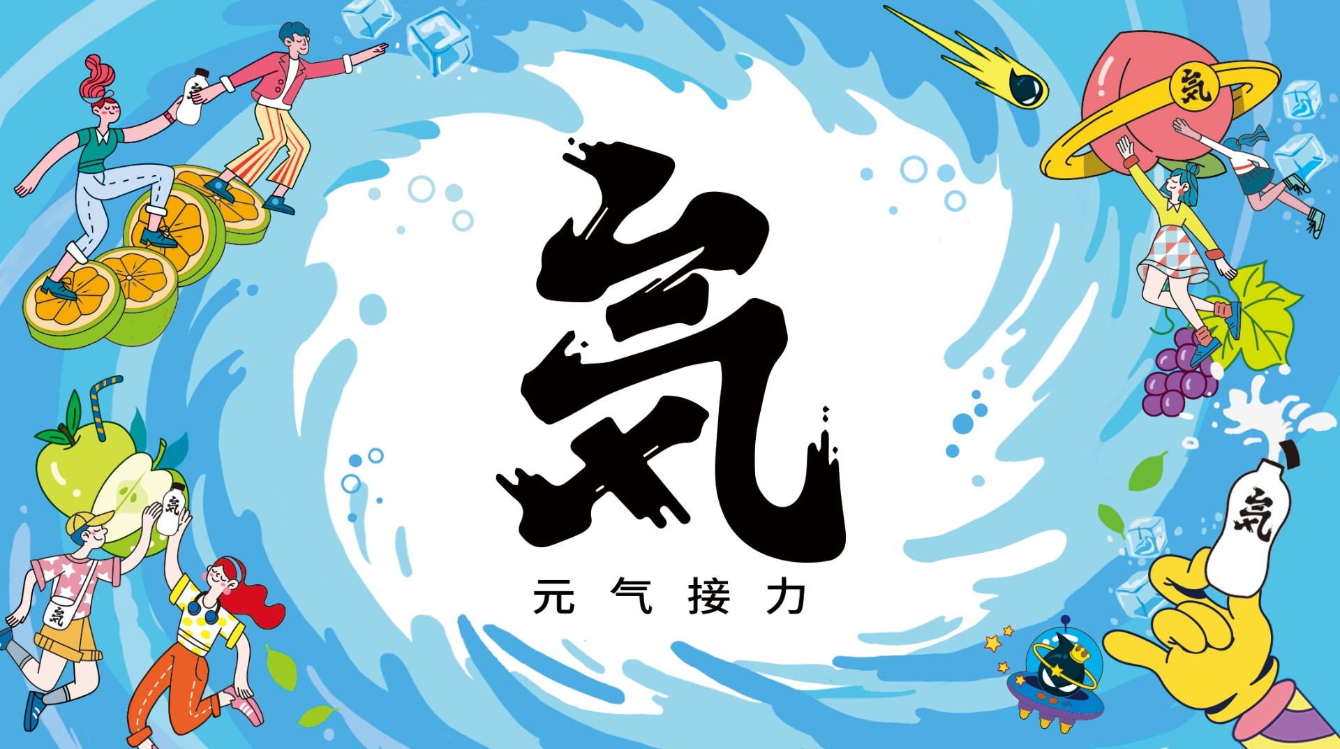 通过对品牌价值和文化的提炼,结合目标用户的情感及体验诉求,创作主kv画面,以超级符号“气”为中心加以时尚活泼的插画元素,是得画面更加年轻化。画面中人物与之间用元气森林饮料互相接力的戏剧化互动,巧妙呈现了主题“元气接力”,从而更好体现其主打的健康饮料的概念。