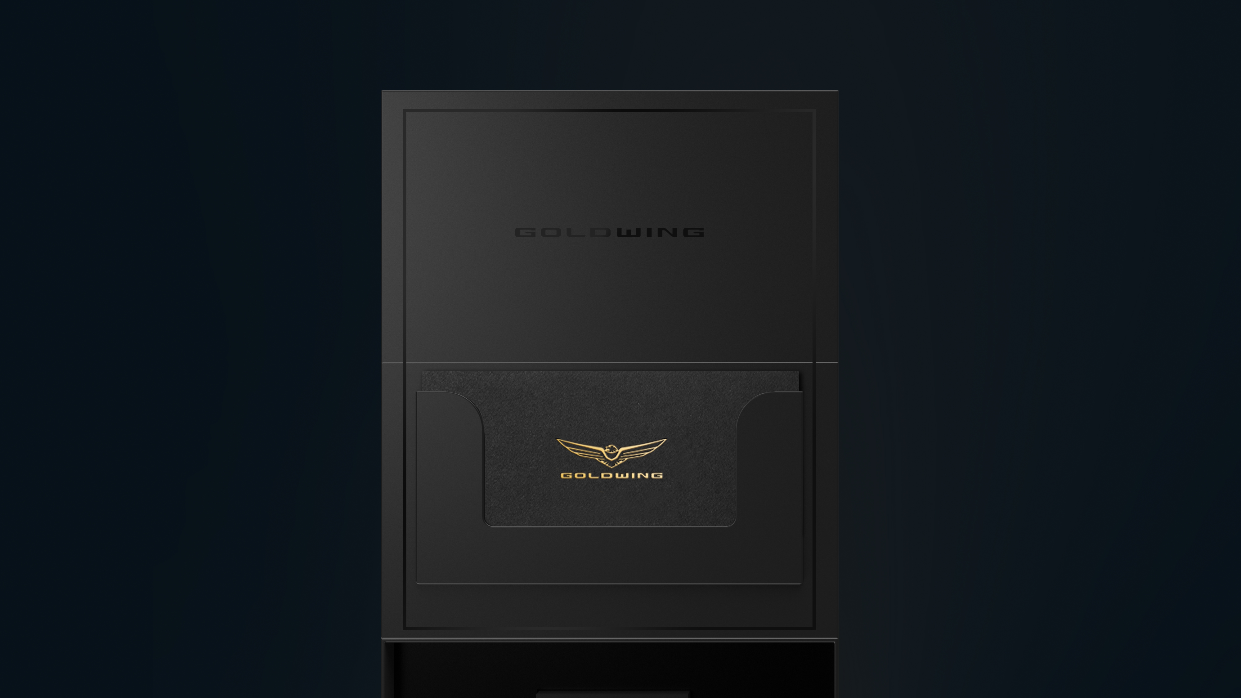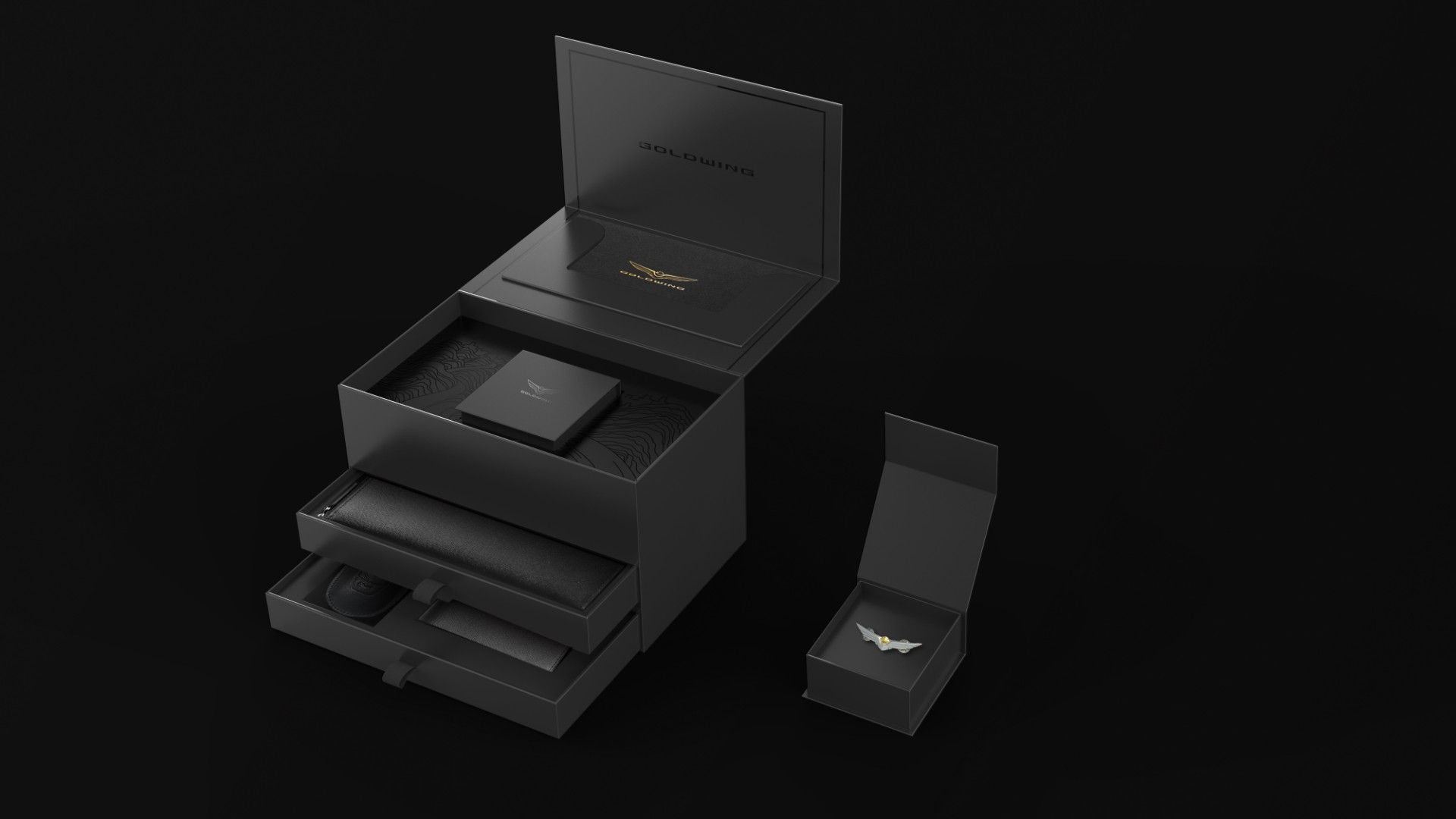 礼盒采用翻盖多层抽屉形式,在封面上采用烫印和凸印工艺,将金翼logo做烫金处理,将城市山川画面元素做烫黑金起凸处理,搭配简洁又不落俗套。呈现低调且高贵的品质感。徽章的包装盒设计了独立小盒,打开后才可以看到产品,体验过程充满探索的神秘感,与本田金翼摩托的精神诉求高度契合。
