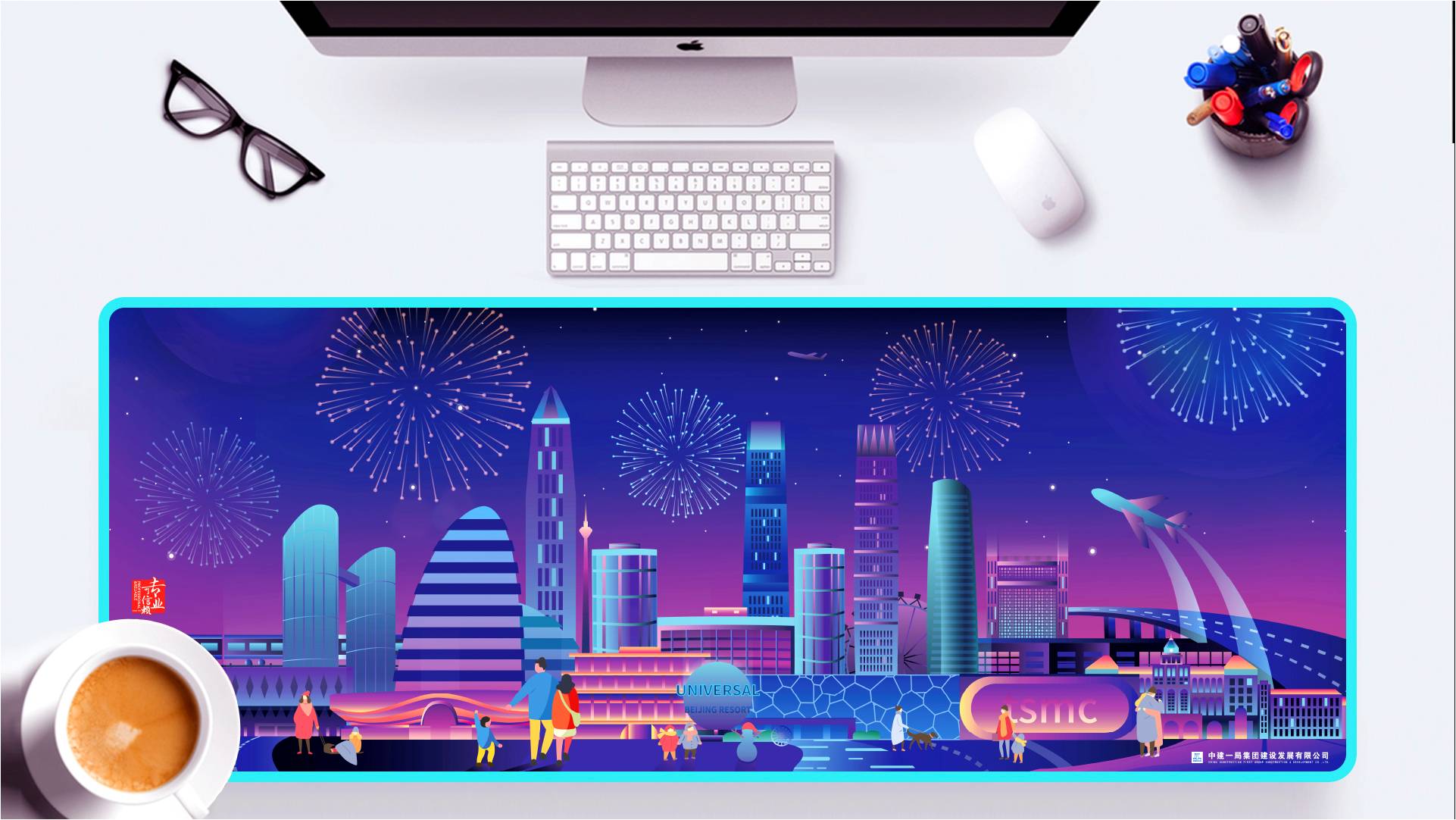 一改建筑行业的刻板、传统的认知,以符合时代审美的表达形式,对年轻人极具吸引力的色彩搭配和潮流文化元素的提取,通过不同插画风格呈现,应用到800*300mm鼠标垫+外包装盒上,通过插画形式体现中建集团的业务实力。