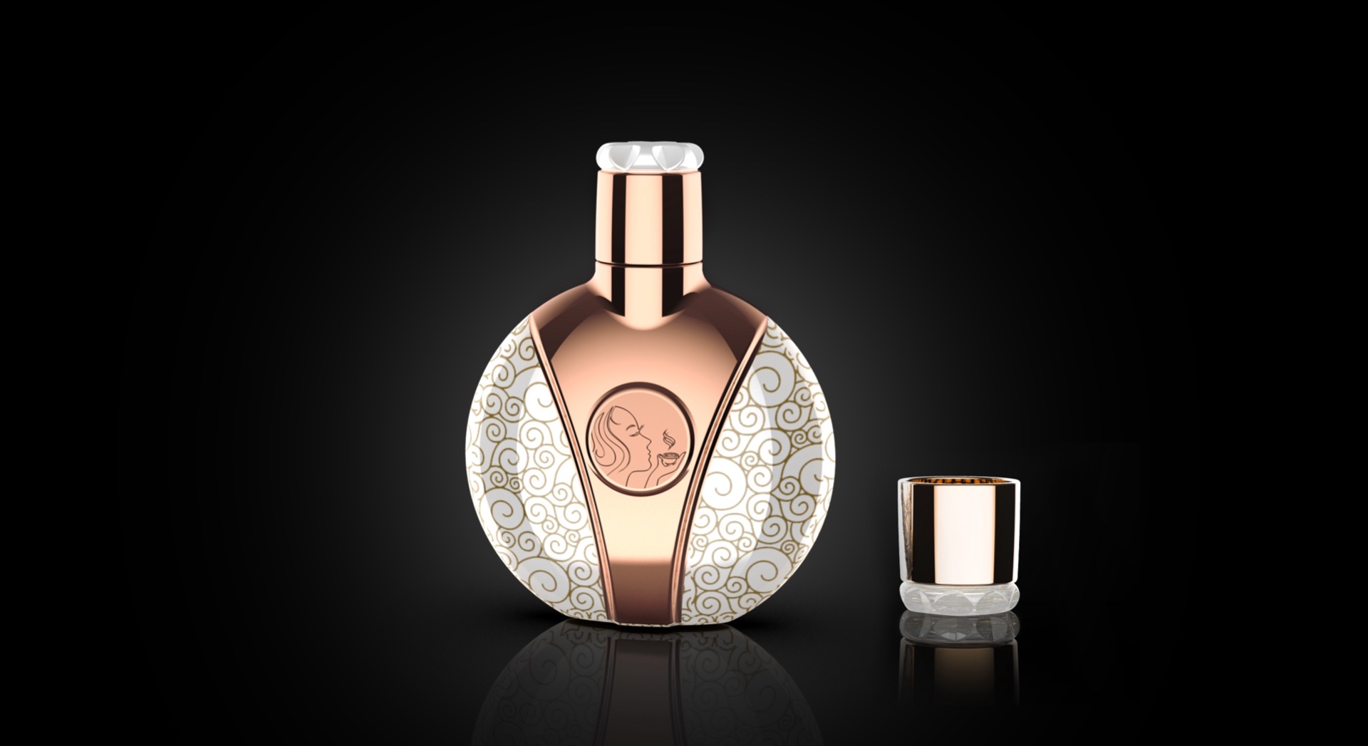 瓶身以玫瑰金的主色调辅配钻石切割工艺,结合镀金巴洛克石纹,诠释品牌奢华基调。瓶身设计符合人体工程学最佳握持手感,瓶盖设计一物两用,可作为品鉴小酒盅,独具巧思。